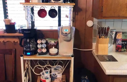 Step into the cozy main room, where you’ll find a classic vinyl record player and a comfortable rocking chair, perfect for relaxing with a favorite book as you gaze out at the scenic views. The fully stocked kitchen has everything you need to whip up home-cooked meals, and our spacious deck is the ideal spot for a family BBQ with a backdrop of serene forest surroundings.
