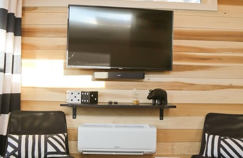 The kitchen and living room feature an open floor plan with a sliding glass door that opens to the deck, where you can sit and take in the incredible views. The living room has a queen-sized sofa sleeper, two lounging chairs, a hand-crafted coffee table with extra bedding storage, and large Smart TV. The kitchen is well stocked with kitchen essentials, beautiful stainless steel appliances, a convection microwave oven for cooking and baking, a stovetop, a large refrigerator, a Keurig coffee machine, granite countertops, farmhouse sink, dishwasher and a table/prep island with seating for four.