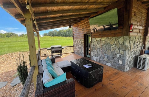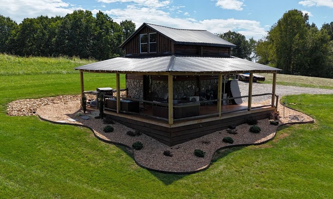 Once a functioning air-curing tobacco barn turned into a Rustic, Cozy Cabin.Each tobacco barn is as unique as the area in which they are constructed. Travel back into the history of the farming and tobacco tradition that has greatly impacted our area. The bottom floor of the cabin contains a full kitchen setup with gas stove and oven, microwave, sink, and Refrigerator. The kitchen opens up to the living room containing a large flat screen tv and couch that pulls out into a bed. The upstairs loft area contains a King Size bed with large flatscreen TV and Dresser. Two large windows look out over the rolling hay fields. Bathroom is located upstairs with a whiskey barrel sink vanity and tile shower with rain shower head and hand wand. Keep in mind that the loft area is accessed solely by ladder and may be difficult to access for some guests. Our outdoor entertainment area boasts a 65” smart TV, a 2-person hot tub/spa, couch and porch swing seating, a gas fire pit, and a blackstone griddle for our guests to enjoy.