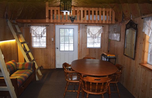 The cabins are fully furnished with beds, chairs, table, and other necessary furnishings, but our guests supply their own pillows, blankets, sheets, towels, pots, pans, plates and tableware. There are bunk beds and a queen bed on the main floor, a queen mattress in one loft and two twin mattresses in the other loft. There is a private portapotty by the cabin, a showerhouse near the main lodge house, as well as sources of potable drinking water.
