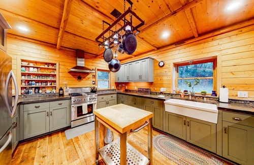 As you step inside, shed your gear in the mudroom cubbies and toss any wet, snowy, or dusty clothes in the adjacent laundry room. Greeting you just beyond is a charmingly rustic living space full of natural wood beams, windows framing the woods, and all sorts of little nooks and hideaways inviting you in. Get started on dinner in the beautiful kitchen with stainless steel appliances and a farm sink, and set the window-lined table for dinner.