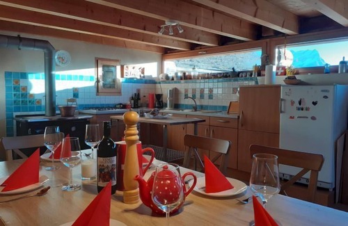 "Rustico Bel Panorama", 3-room house. Spacious, partly with sloping ceilings, simple and practical furnishings: open dining room with dining table, satellite TV and CD-player. Exit to the garden. Open kitchen (Gas stove, 4 gas rings, electric coffee machine, fondue Set (cheese)) with wood-burning stove. Shower/WC. Wood heating. Solar power. Upper floor: open living/sleeping room with 1 double bed (1 x 160 cm, length 200 cm), satellite TV. Exit to the terrace. 2nd upper floor: open, with sloping ceilings with 4 beds (90 cm, length 200 cm). Garden. Terrace furniture, barbecue, deck chairs (2), sitting area. Marvellous panoramic view of the mountains, the valley and the countryside. Facilities: children's high chair, baby cot for up to 2 year olds (extra). Please note: non-smoking house. Maximum 1 pet/ dog allowed. Instead of an enclosed bedroom, some sleeping areas are located in an open-plan area (gallery, alcove, etc.). NL-00007160