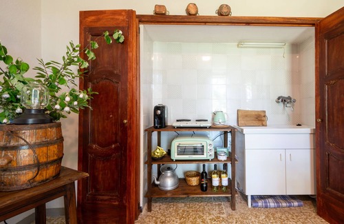 "Rustico Pio Filippo", 2-room apartment 70 m2 on 1st floor. Simple and comfortable furnishings: living/dining room with 1 sofabed and open-hearth fireplace (only for decoration), dining table and air conditioning. Exit to the balcony. 1 double bedroom. Kitchenette (2 hot plates, mini-oven, kettle, electric coffee machine). Hip bath/WC. Forced-air heating. Small balcony, large garden. Terrace furniture, barbecue, deck chairs. View of the garden. Facilities: children's high chair, baby cot for up to 2 year olds, hair dryer. Internet (WiFi, free). Maximum 1 pet/ dog allowed. IT006165B56ZHCAFEH