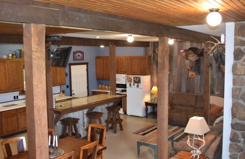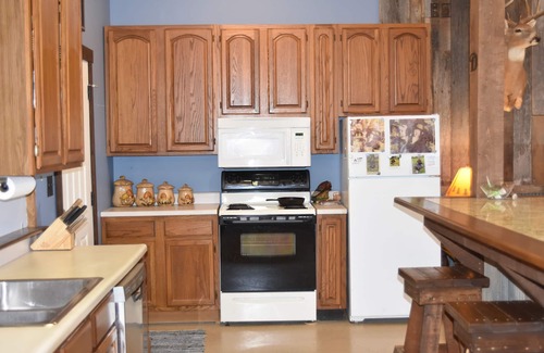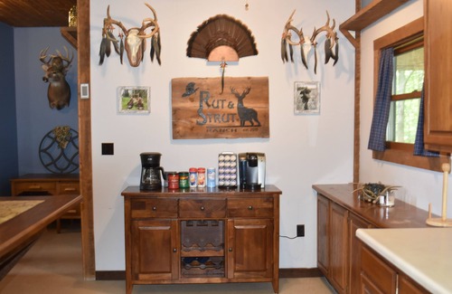 Relax with the whole family at this peaceful place out in the country. Rut & Strut Ranch is nestled in the country with woods surrounding it. Come to enjoy the serenity of nature; birds chirping, wildlife abundant, find peace in the quiet woods, fish in the pond, and so much more! The cabin is wildlife themed with deer and turkey mounts. The rich wood trim is milled from the property and offers a cozy feel. Rut & Strut Ranch is 35 mins from Mark Twain Lake, 10 mins from Mexico and 40 mins from Columbia.
