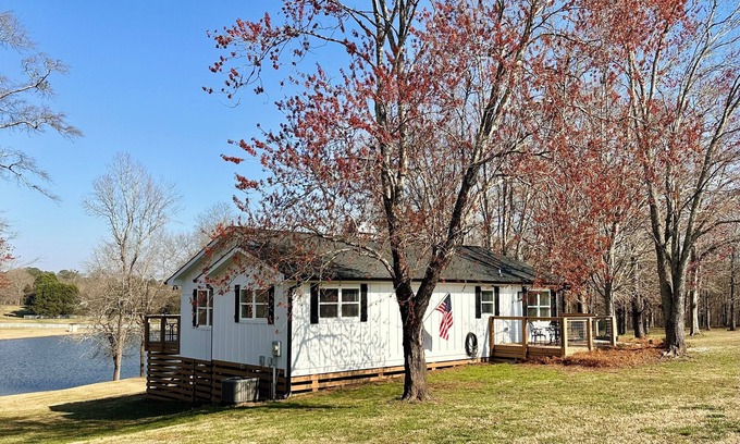 With amenities designed for both relaxation and celebration, Ruth's Cottage features cozy sleeping arrangements in a king bedroom and a full bedroom, ensuring restful nights before and after your big event. The stylish living space includes a smart TV, while the outdoor deck showcases majestic sunrise views over the private pond, creating a picturesque backdrop for morning coffee or evening gatherings. You will love enjoying the firepit and grilling on the deck under twinkling string lights, sharing heartwarming moments with friends and family. Additionally, fishing gear and kayaks are available to explore the scenic surroundings, making it easy to unwind during downtime.