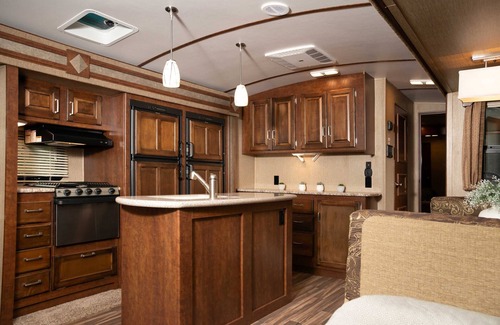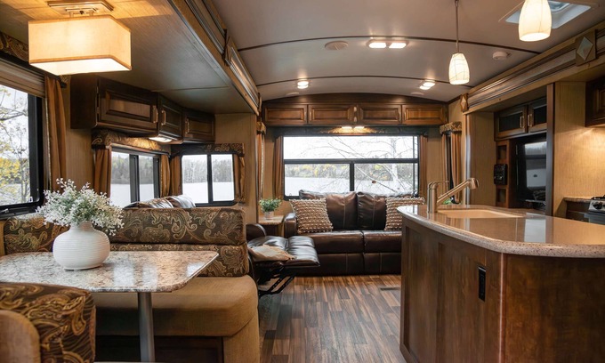 Designed for comfort and style, the RV boasts three slide outs and accommodates up to four guests, making it ideal for a family getaway or a peaceful escape for two. The rear living area is a haven of relaxation, featuring reclining leather theatre seats and a sofa sleeper, all positioned to take advantage of the panoramic lake views. Entertainment is at its finest with an electric fireplace, a large screen TV, and an inviting ambiance.