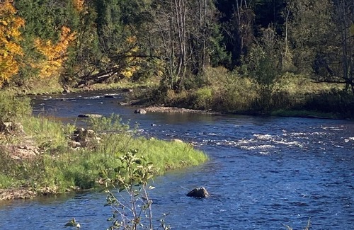 There is a gravel path leading back to our cabin on the Deer River, which hopefully will open next spring. You are welcome to walk or bike the trail and enjoy the riverfront back there!