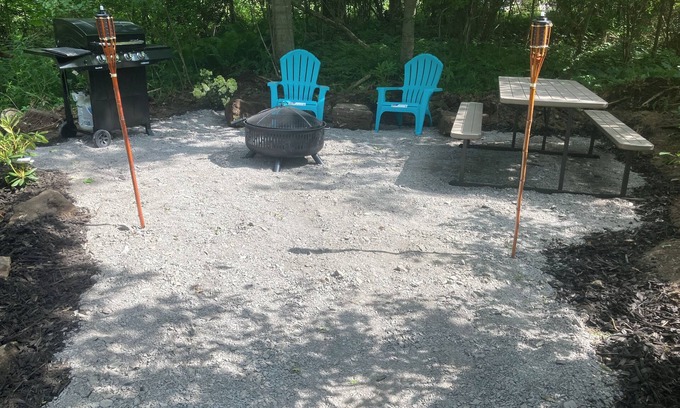 This site is private yet close to the road. There is 50 amp as well as 110 electrical service at your site. Just behind where you will park is your private picnic pad with a propane grill, picnic table, Adirondack chairs, fire pit, and tiki torches.