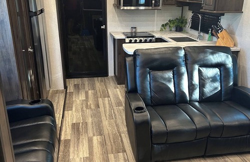Very spacious and shaded RV campsite that Sleeps 7. Garage converts to two queen size bunks as well as an overhead bunk space for kids or teens. The master bedroom has king sized bed and is very comfortable with its own adjustable HVAC. Starlink high-speed internet provided for streaming and kicking back after a day of touring or roaming historic sites.