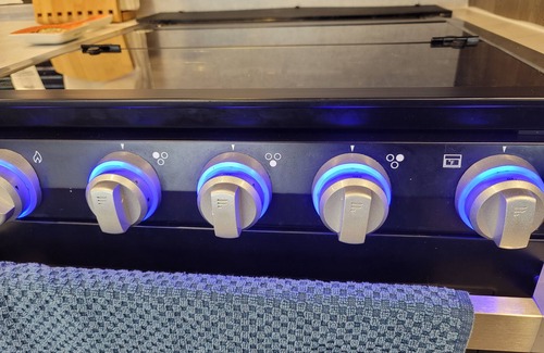 Are you wanting a cozy night in while glamping? Your living room has a fold out couch with a large 50" 4K TV, Blu Ray DVD player and a wide variety of DVD's or streaming services to choose from.