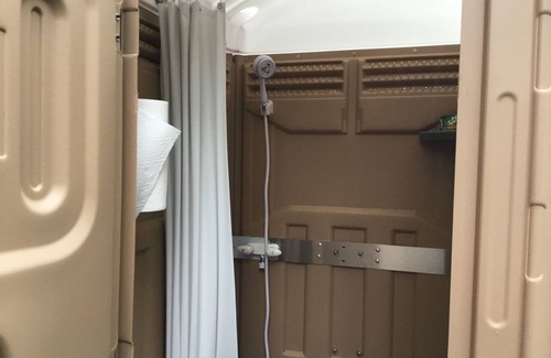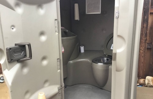 Cement garage driveway with 50 amp plug-in/water hook up. Sewer disposal available through mobile vendor. Access also available to all the cabins amenities when it is unrented, to include the pool, spa, volleyball, badminton, and Pickleball. Access also to outdoor showers and flushable Porta potty’s! We are in the heart of the Big Belt Mountains of Montana.