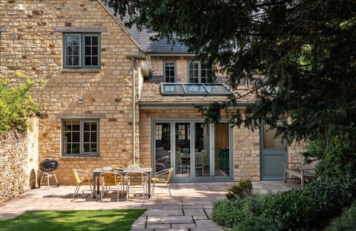 Welcome to Ryeworth Cottage. This beautifully designed property combines timeless charm with modern comforts, offering ample space to accommodate six guests. Whether you're planning a small family getaway or a gathering with friends, Ryeworth Cottage offers an exceptional space with thoughtful details and luxurious touches for a memorable stay in the heart of the Cotswolds.From the entrance hall, double doors open into a large open-plan living room with traditional cottage charm, including stone floors and cozy window nooks perfect for reading. Comfortable sofas provide a warm and inviting space to relax, while the dining area benefits from natural light streaming through French doors that lead to the patio. Underfloor heating and an advanced air-circulation system ensure year-round comfort.The dining area also features a four-oven Aga (available by prior arrangement), a large extendable dining table, and a breakfast bar. The fully fitted kitchen is exceptionally well-equipped, making it easy to cater for larger groups or intimate family meals. On the ground floor, there's a separate utility area and a downstairs bathroom.Ryeworth Cottage has a large multi-purpose basement playroom, perfect for children and adults alike. For added convenience, the basement also includes a kitchenette with extra tableware, chairs, and tables—making Ryeworth an excellent choice for large family gatherings.The rear patio is a perfect spot for outdoor dining, featuring a table and chairs for six guests and a large grill. From here, you have access to free parking as well as the beautifully landscaped 5-acre gardens of Kingham Lodge and the nearby pool house.The primary bedroom is a serene haven featuring a luxurious king-size four-poster bed and a private en-suite bathroom. Nearby, a cozy twin bedroom provides flexibility and is served by a separate family bathroom complete with a shower over the tub, perfect for relaxing after a day of exploring the Cotswolds. On the second floor, you'll discover a double-aspect twin bedroom flooded with natural light.This room boasts its own en-suite bathroom for added convenience. The twin beds can be zip-linked to form a super-king bed upon request, offering additional flexibility for your group.Ryeworth Cottage is thoughtfully designed for families with young children, offering a stair gate, highchair, and travel crib. A larger crib or newborn cradle can also be provided upon request for a small supplement ($20). To maintain the property's high standards, Ryeworth Cottage is a pet-free and smoke-free property.For larger family gatherings you may also wish to book the adjacent 'Kite's Gate' which shares the garden & parking spaces with Ryeworth Cottage. This will give you 6 bedrooms and bathrooms. The owners at Kingham Lodge have 5 holiday cottages available on site for large gatherings sleeping up to 26 people. Do call us about booking multiple cottages for a large family celebration.There are 5 cottages on site and operate a private 'swim time' for each individual cottage, so all groups of guests have private family time in the pool. Your time changes each day and this information is shared with you in your booking confirmation email. You can also enjoy an early morning swim that is open to everyone. The pool is used by Kingham Lodge owners only after 4:30 pm. Pool towels are provided for you in your cottage and the owners will give you a pool safety briefing on arrival.