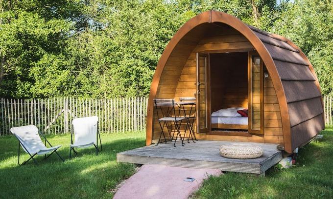 Le Pod est équipé d'une chambre et terrasse avec vue sur le canal, d'un chauffage et d'électricité.