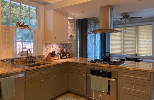 The kitchen has plenty of room with a full size refrigerator, microwave, oven, hood vent, air fryer, wine opener, and all the plates and utensils you'll need. Use of the oven in summer can make the inside warmer. If you prefer, there's a PitBoss 8-in-1 smoker/grill that you can use to smoke, bake, sear, grill, roast, etc...