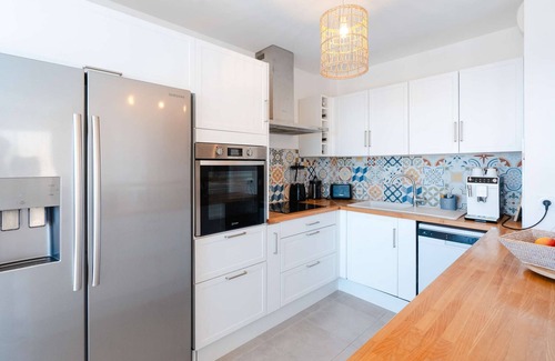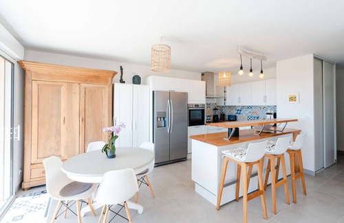 The bright, air-conditioned lounge-kitchen area features a well-equipped open-plan kitchen (3-burner induction hob, extractor hood, coffee machine, kettle, toaster, oven, microwave, dishwasher, American-style fridge with freezer compartment, bar with 3 high stools), flat-screen TV (French DTT channels), dining table for 4, comfortable corner sofa.