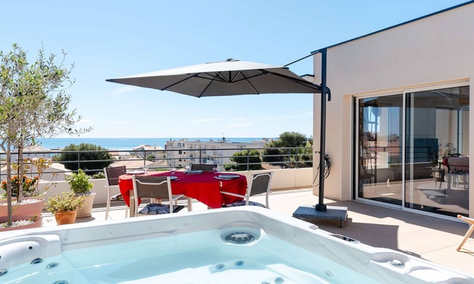 Quality features: air conditioning in living room and bedrooms, sea and Clape views, large terrace with jacuzzi, WIFI, bed linen and towels included, private parking space, pets not allowed. Keys handed over at the rental location.