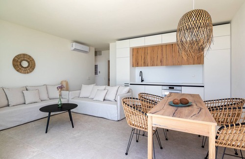 The villa is located on the edge of the resort area on a spot that offers panoramic sea view. A welcoming terrace with comfortable built sofas and dining area next to BBQ, will relax your senses. In the private pool with sunbeds and the garden, overlooking the endless sea view…the calmness will overwhelm you. Open plan living area, TV corner, dining area connecting with spacious open plan fully equipped kitchen.