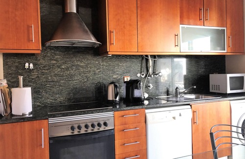 Kitchen equipped with ceramic hob, oven, microwave, dishwasher, washing machine, electric kettle, coffee machine, dishwasher, and refrigerator with freezer.