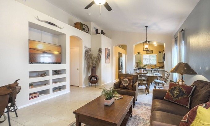 Get ready for an Old West adventure! Whether you're a solo traveler on a mission or a couple seeking sun-soaked relaxation in the Valley, our 3 BR single-story, stair-free house is the perfect spot. Families with little explorers are welcome, too! Nestled in a quiet neighborhood, our backyard provides privacy and peace of mind. Unwind in the cabana with a gas fire pit, enjoy a meal at the dining set, and try your hand at the putting green.