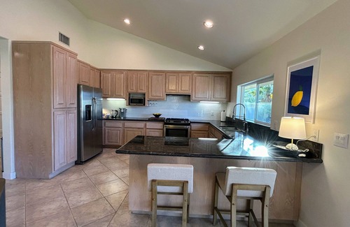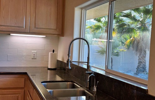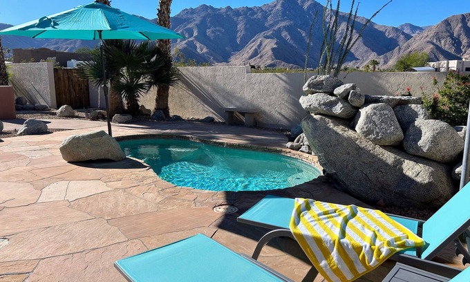 Our home will draw you in with its palm lined driveway and generous parking. Step on to the front porch with a direct view to Font’s Point from the open door. The house itself is single level, with an open floor plan, and easy layout including two bedrooms and two baths. Just remodeled and updated, all the furniture is new, including high-end Sealy motion stabilization beds. Our large kitchen is fully equipped with a focus on making the chef in the family happy (good cookware, knives, and equipment). Step outside the house into the private, walled patio to a beautiful plunge pool, heated October through May, custom fire pit, outdoor kitchen, and a peaceful desert path. There is a full sized washer and dryer in the open and clean two car garage.