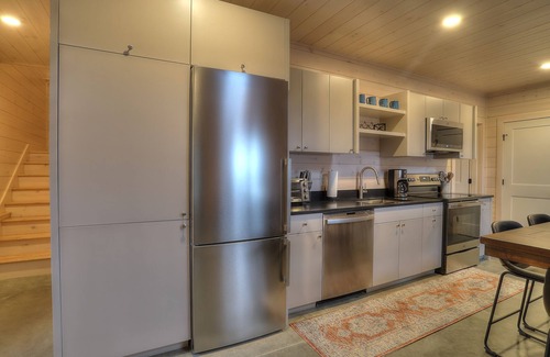 Inside, the home features polished concrete floors with radiant heat, ensuring warmth and comfort after a day of skiing or outdoor adventure. The open floor plan creates a cozy atmosphere, perfect for gathering with family and friends. Large windows allow for stunning views of the mountain and provide ample natural light, enhancing the connection to the outdoors. After a day on the slopes or trails, relax and unwind in the spacious living areas.