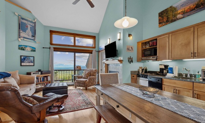 The condo's open-concept living area includes a fully equipped kitchen, dining space, and a comfortable living room with a fireplace. Large windows and a private deck offer stunning views of Saddleback Lake and the East Kennebago Mountain Range, enhancing the serene mountain retreat ambiance. Additional amenities such as in-unit laundry facilities and ample storage for ski gear add to the convenience and appeal of this vacation rental.