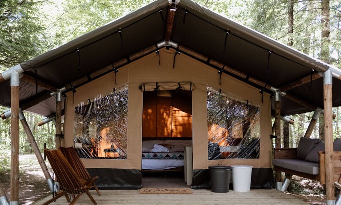 Safari Tent Site 4 | 1 King Bed | Pond View | RV Rental in Woodstock