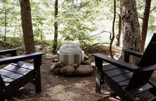 Outside the tent, we’ve got you covered with a fantastic firepit & grill, Adirondack chairs overlooking the brook, a comfy hammock, a picnic table, and, of course, a beautiful private setting surrounded by trees, overlooking the mountains in the background.