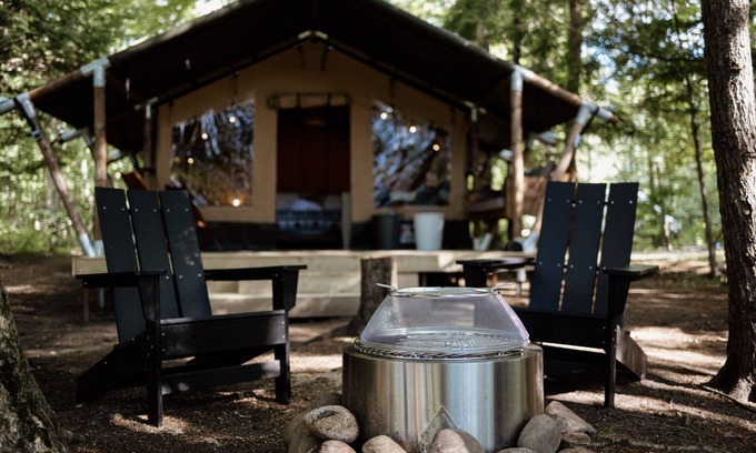 Safari Tent Site 5 | 1 King Bed | Pond View | RV Rental in North Woodstock