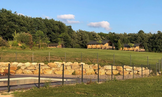 Our private 3hec site welcomes only 5 safari tents , and 2 trappeur cabins. A maximum of around 50 guests share the amenities : heated pool, kids play area, many outdoor games to lend, and a bar for special evenings in a friendly environment.