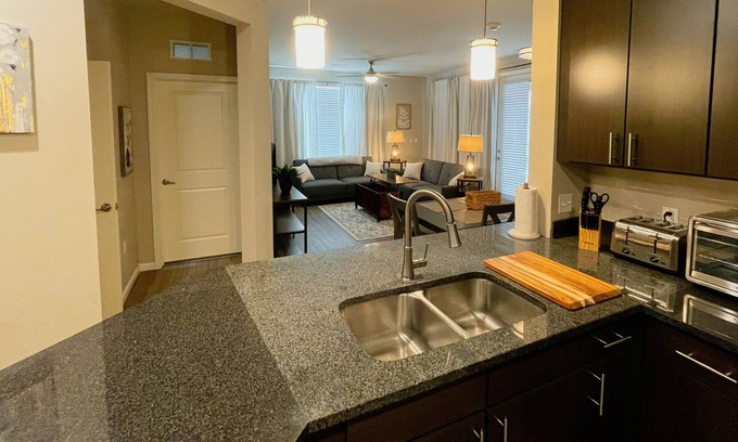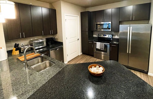 Fully equipped modern kitchen. Ground level, thoughtfully furnished space is your home away from home. Centrally located with easy highway access! Great for travel nurses, students, families and professionals. Close to shopping, dining, parks, and entertainment. Pet friendly!