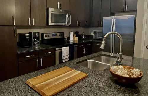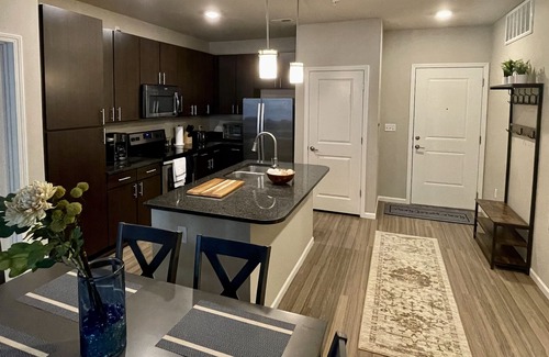RARE FIND! Spacious 2BR/2BA sleeps up to six! This ground level, thoughtfully furnished unit is your next place to call home. Centrally located with easy hwy access! Great for traveling nurses, students, families & professionals. Minutes from shopping, dining, parks, & entertainment. Pet-friendly! FREE 5-star amenities: pool, gym, cafe bar, biz center, package delivery room, & more. BRs feature queen beds, smart tvs, & large walk in closets. Book now to enjoy this clean & cozy retreat!