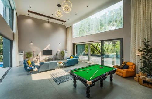 Offering a garden, SaffronStays Six Degrees features accommodations in Alibaug. This property offers access to a terrace, free private parking, and free Wifi. The villa offers an outdoor swimming pool and private check-in and check-out. With 6 bedrooms, this spacious air-conditioned villa features 6 bathrooms with a bidet, a bath, and free toiletries. A flat-screen TV is featured. The property offers garden views. Chhatrapati Shivaji International Mumbai Airport is 59 miles away.