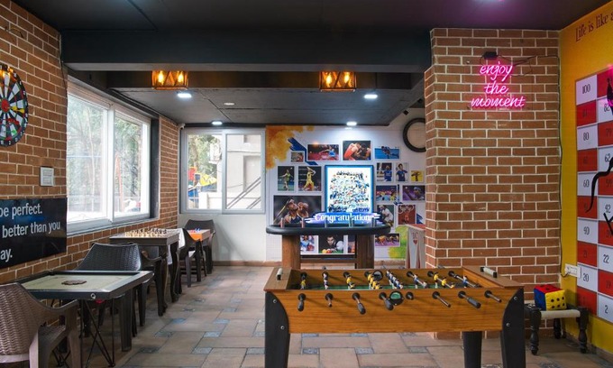 SaffronStays The Fusion, Lonavala - pool villa with hip interiors and indoor games offers accommodations in Lonavala, a 13-minute walk from Lonavala Train Station and 2.6 miles from Kune Waterfalls. This property offers access to a terrace, free private parking, and free Wifi. City views are a highlight at the villa's pool. Offering 6 bedrooms, this spacious air-conditioned villa features 7 bathrooms with a walk-in shower, a bath, and free toiletries. Guests can take in the views of the pool from the balcony, which also has outdoor furniture. The villa offers bed linen, towels, and daily room service. There is an on-site bar. For guests with children, SaffronStays The Fusion, Lonavala - pool villa with hip interiors and indoor games features an indoor play area. Guests can relax near the outdoor fireplace at the villa. Bhushi Dam is 3.9 miles from the accommodation, while Lion's Point is 7.3 miles from the property. The nearest airport is Pune International Airport, 43 miles from SaffronStays The Fusion, Lonavala - pool villa with hip interiors and indoor games.