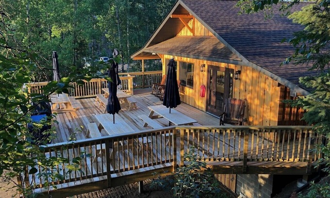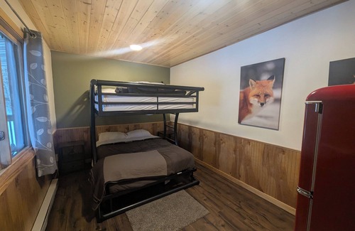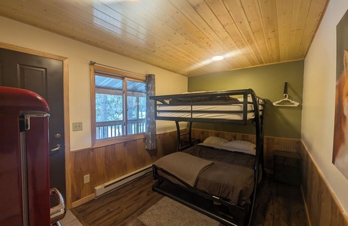 Room 4 ~ 2 Full size bunk style beds sleep 4 people! Perfect for couples, friends, or small family vacations. The room has its own private bathroom, fridge/freezer, microwave. There is a community space with a kitchen and both an indoor and outdoor seating. The deck overlooks the lake and is a great place to gather with friends for dinner. Located on the edge of the boundary waters.