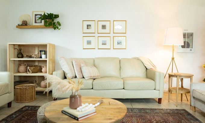 Relax in the spacious living area with plenty of natural light, comfortable seating, original artwork and books for your interest. Enjoy watching your favorite shows on our 50 inch smart TV with access to Netflix, Hulu, and Disney +. Conveniently, you’ll also find a corner desk pace for when it’s time to work.