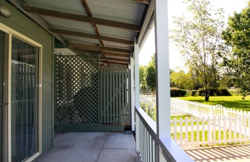 The studio is a renovated cabin with an open plan living/ dining/ kitchenette/ bedroom space with a Queen bed with linen and bed making included. The kitchenette has a microwave and bar fridge and the living area provides a split system air conditioner, Smart Tv and unlimited Wi-Fi. There is also a stylish bathroom with a rainwater shower head in the shower, vanity, and toilet and access to the shared laundry facilities with a top loader washing machine and dryer, and a fully enclosed yard backing onto the horse paddocks. Off-street parking is available for one vehicle per cabin.