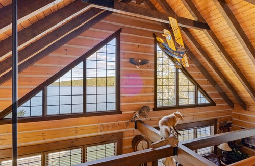 This cabin is situated perfectly on a flat peninsula lot with lots of outdoor space for outdoor activities and entertainment. Relax on one of the many porches while taking in the fabulous 360-degree views or grill up your favorite meal on the charcoal grill and enjoy it under one of the covered porches and take in the scenery! There is also a boat ramp on the property for your use!