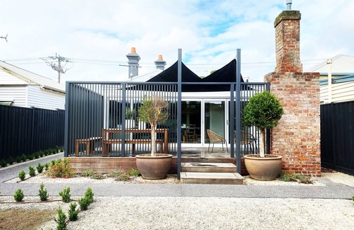 Saint Brides boutique accomodation offers elegant and stylish accomodation in the sought after area of Geelong West. Although compact, your cottage provides three TVs - all with complimentary Netflix, 3 elegant bedrooms - 2 with luxurious King beds, 2 bathrooms - including a free standing bath, a fully equiped kitchen including dishwasher, microwave, washing machine and dryer combo. Six metre bifold doors expand the living room onto a north facing deck area - creating an awesome space for eating and relaxation. The driveway caters for 2 cars which is a real bonus in the Geelong West area.