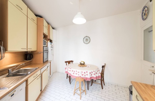The living room is divided into a seating and dining area. It is bright due to the large windows and tall ceilings. There is an ornate fireplace and classical French-style furniture and wooden parquet flooring. There is a sofa as well as a sleeper couch (double 140cm), a glass coffee table and some occasional arm chairs with a footstool to match. The round wooden dining table is by the ornate fireplace and comfortably sits up to six people.