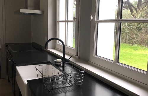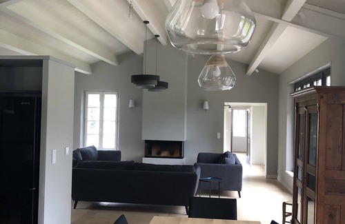 Very quiet new house on a plot of 3000 m2 with old oak trees; 5 bedrooms: bedroom 1: 180 bed; bedroom 2: 160 bed; bedroom 3: 4 single beds; bedroom 4: 160 bed and 90 bed; bedroom 5: 160 bed or 13 beds. Large living room with 3 large sofas and a fireplace; open kitchen with wood stove; utility room (with second sink and second dishwasher); oak parquet; benefits of great comfort. Large terrace opening onto the garden. Large garage. Design decoration. Less than 5 minutes walk from the center of Saint-Sauveur. 1 bathroom and 2 shower rooms. 3 toilets. Laundry room with washing machine and dryer. Many wall cupboards.