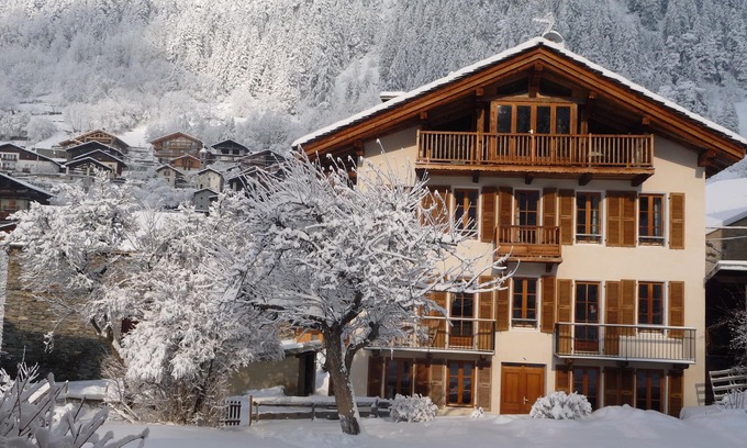 Very nice duplex 150m2 charm and comfort - quality food in an old cottage in a village in Haute Tarentaise, the starting point for many hikes in summer and winter. Near the ski resorts of Sainte-Foy (10 mins), Val d'Isere (20 min), Tignes (15min by The Brévières), Les Arcs (5 min by Villaroger), La Rosiere-La Thuile Italy (20 min) . Can comfortably accommodate 8 people: 5 bedrooms - 8/9 beds - 3 bathrooms - terraces - open views south - garden - garage - ski storage. Wireless.