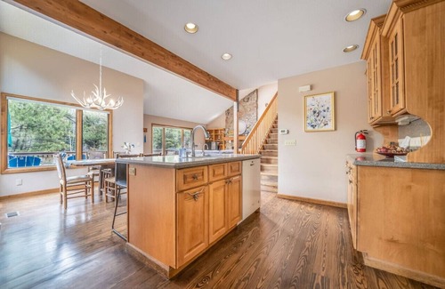 Our family-friendly home has a king maser suite, two queen bedrooms, an open living/dining area, and a basement with a game room, reading nook, pool table, piano, and a pullout sofa in front of a cozy fireplace.