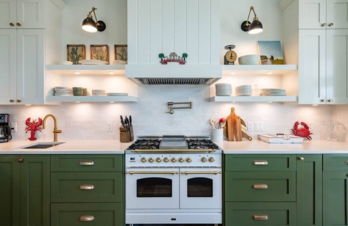 Fully equipped kitchen with Quartz countertops, custom cabinetry, island with farmhouse sink, prep sink, ThinQ stainless French door fridge with water/ice dispenser, Bosch stainless dishwasher, ILVE Nostalgie Series Italian gas range, 2 beverage refrigerators, wet bar, pantry, microwave, dishwasher, drip coffee maker, toaster oven, blender, 2 washers and dryers.