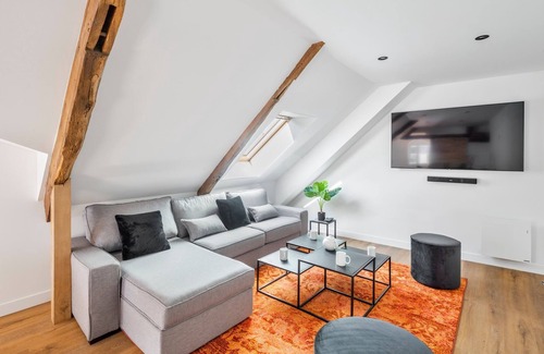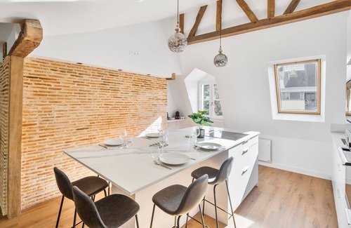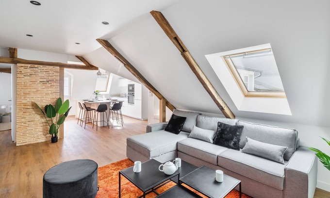 Cocoonr agency offers this beautiful 65 m² attic apartment for rent in Rennes, ideal for 6 people. It's close to the old Saint Etienne theater, Place des Lices and Sainte-Anne. Located on the 3ᵉ floor (no elevator), this fully renovated apartment features a large living room, an open kitchen, two beautiful bedrooms and a bathroom.