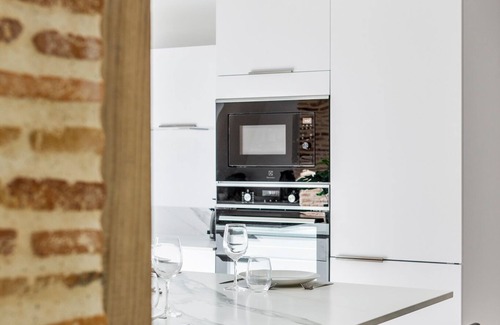 - A modern, fully-equipped kitchen with oven, dishwasher, induction hob, fridge with freezer and all small appliances (Nespresso coffee maker, kettle, toaster, etc.), as well as a central island where you can enjoy your meals.