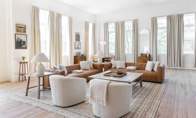 The space features high ceilings, over a dozen large windows, original century-old wood floors and a completely open concept design. Our French cottage inspired kitchen features an Ilve range, a vintage style refrigerator, an antique farm sink, a large prep island, and all the smaller appliances, cookware and serveware you need to stay in and host. A large farm table capable of seating 8 sits between the kitchen and living room.