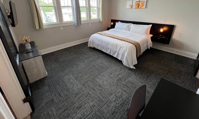 This spacious room is270 square foot andfeatures a king size bed, 39" HDTV with Hulu Live & Netflix, closet,and customtiled rainfall shower with glass door.