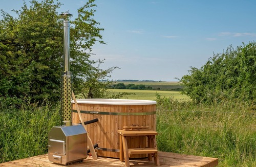 Outside the hut, there is a lawned area surrounded by a wired fence, as well as a fabulous wood-fired hot tub that overlooks the marshes and the sea, a perfect relaxation spot after a long day exploring the North Norfolk Coast.