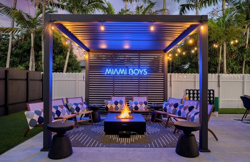 Firepit Area: Cozy under the pergola by the “Miami Boys” neon sign.